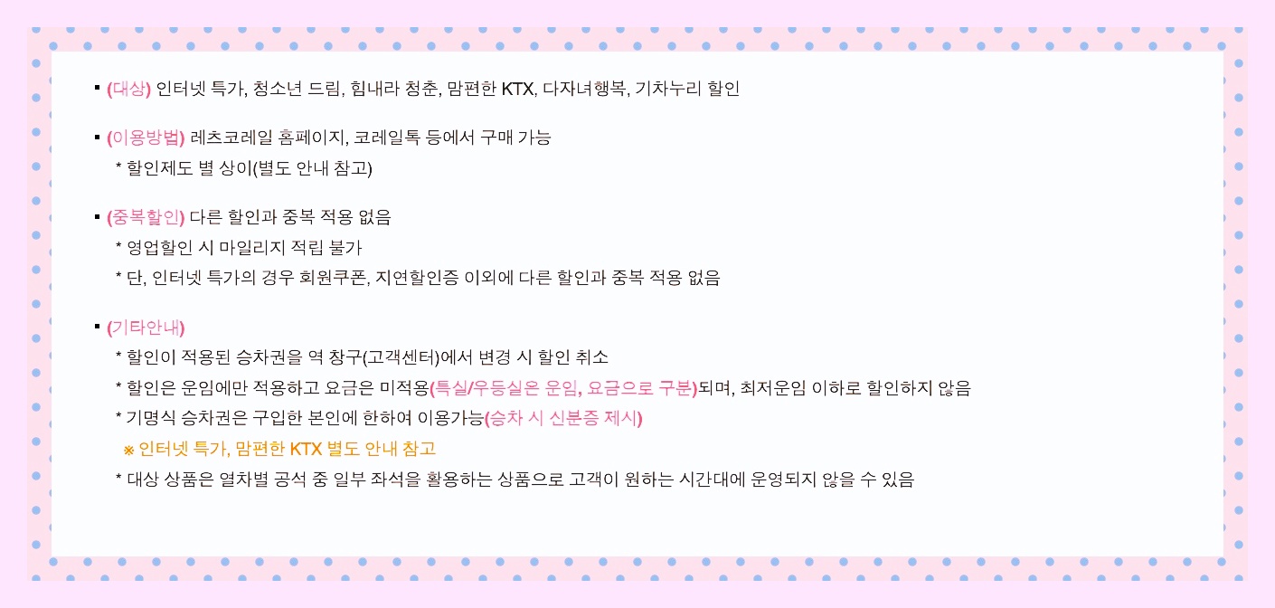 - 할인 혜택: KTX 이용 전 다양한 할인 옵션을 확인하세요. 최대 50%까지 할인 받을 수 있는 기회를 놓치지 마세요.